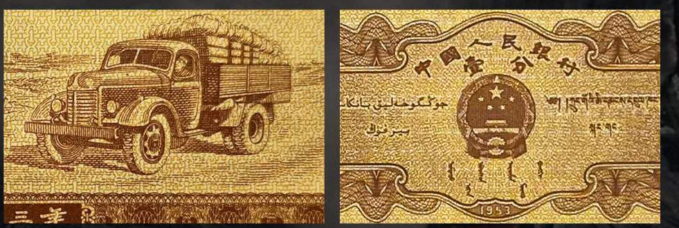 卡车壹分于1955年3月1日发行,其正面是吉斯150型重载卡车行驶图,表现了当时新中国社会主义建设的新风貌。背面是国徽、花符以及汉、蒙、维、藏文字组成的“中国人民银行壹分”,首次综合采用四种民族文字设计,具有划时代的意义。